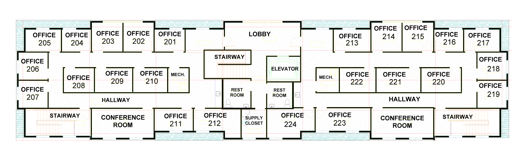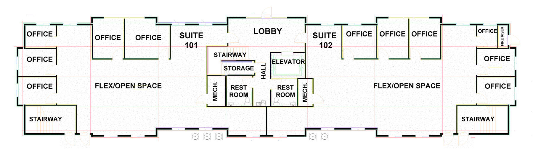 Fully equipped business center with color printing, copy, fax and scan capabilities, a break room, and stair and elevator access.